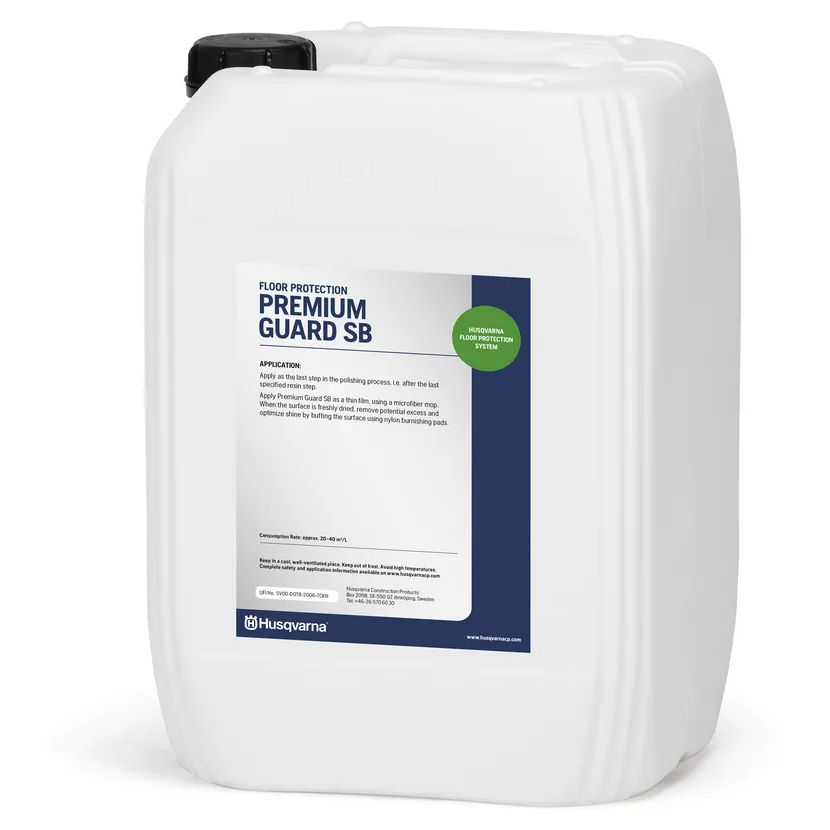 PREMIUM GUARD SB is a solvent-based fully penetrating guard that is very easy to apply and provides premium protection. It creates a hydrophobic barrier that will prevent liquids to penetrate the polished concrete surface, but with limited protection against topical harsh spills and chemical attacks. It is not a surface/topical sealer and therefore cannot blister, wear off or discolour. It is UV stable and also aids in enhancing the colour of the floor and imparts high gloss when burnished. Can also be used on natural stone such as marble, limestone or granite. For indoor and outdoor use.